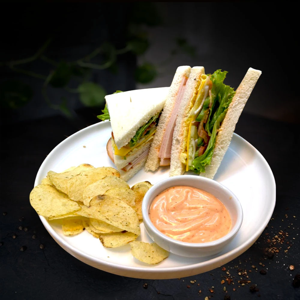 Smoked chicken, cheddar, fresh greens & tomato on soft white bread — served chilled with seasoned crisps and a creamy house dipping sauce.